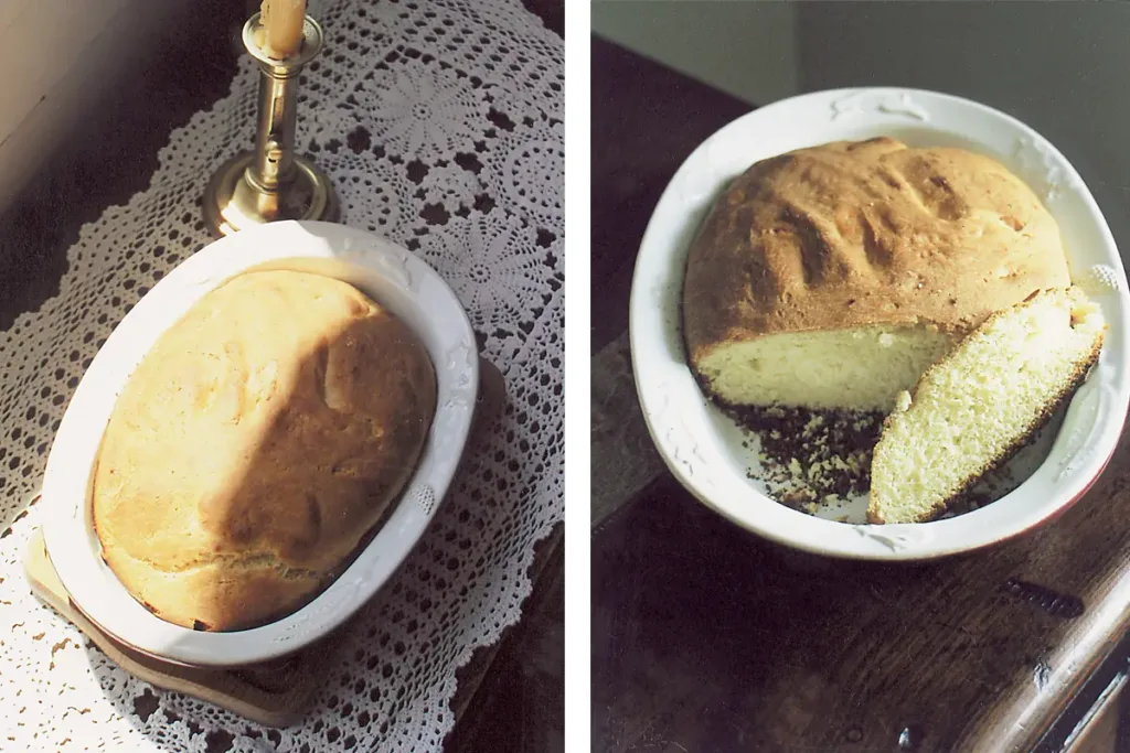 À gauche : pour deux falues moyennes, selon la recette, la pâte est en train de lever ; à droite : pâte levée. (Photos Georges Bernage © Patrimoine Normand.)