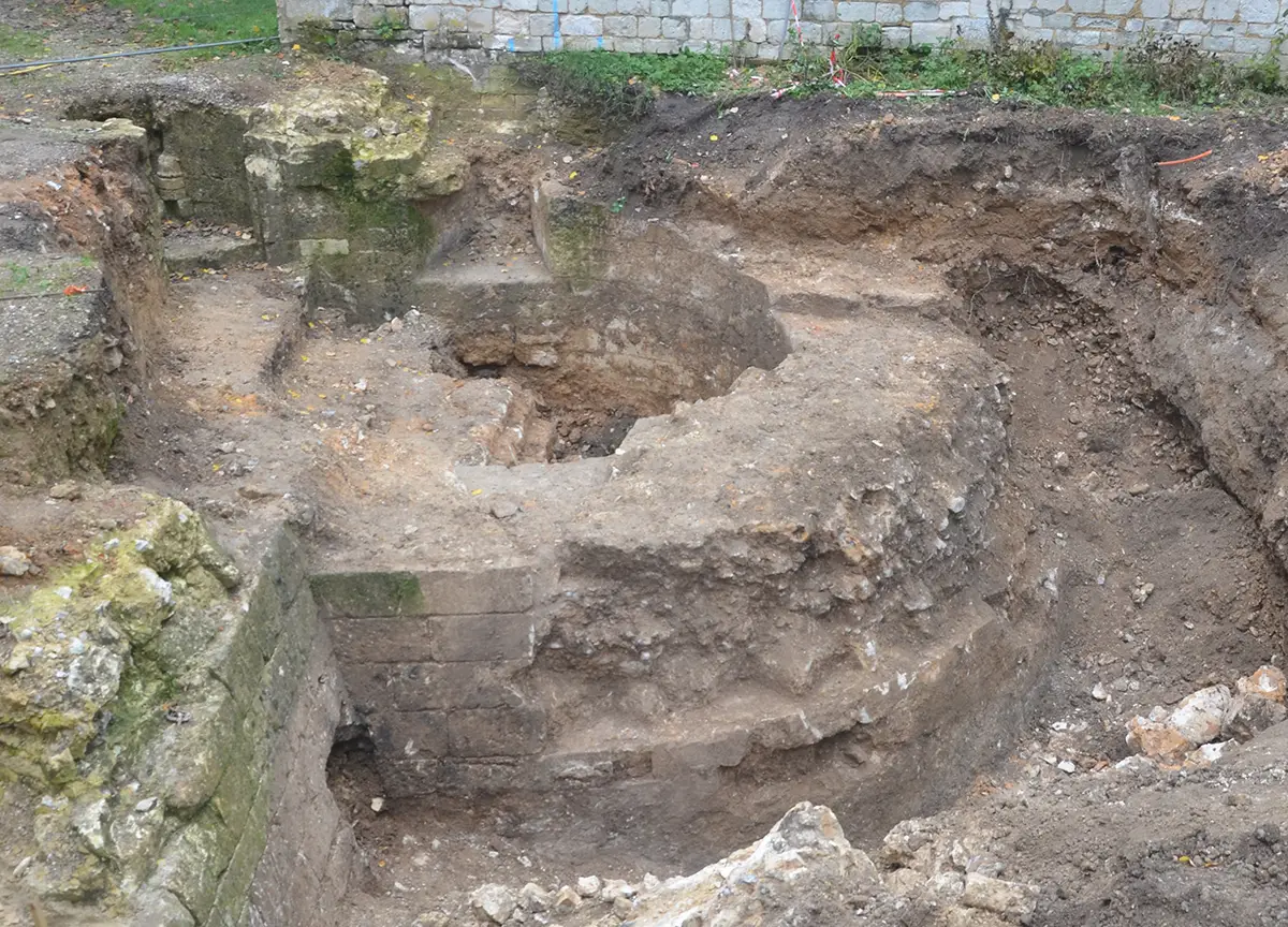 Abbaye du Bec-Hellouin. Dégagement des vestiges d’une tour et d’un tronçon de courtine à l’hiver 2015. (© Erik Follain)