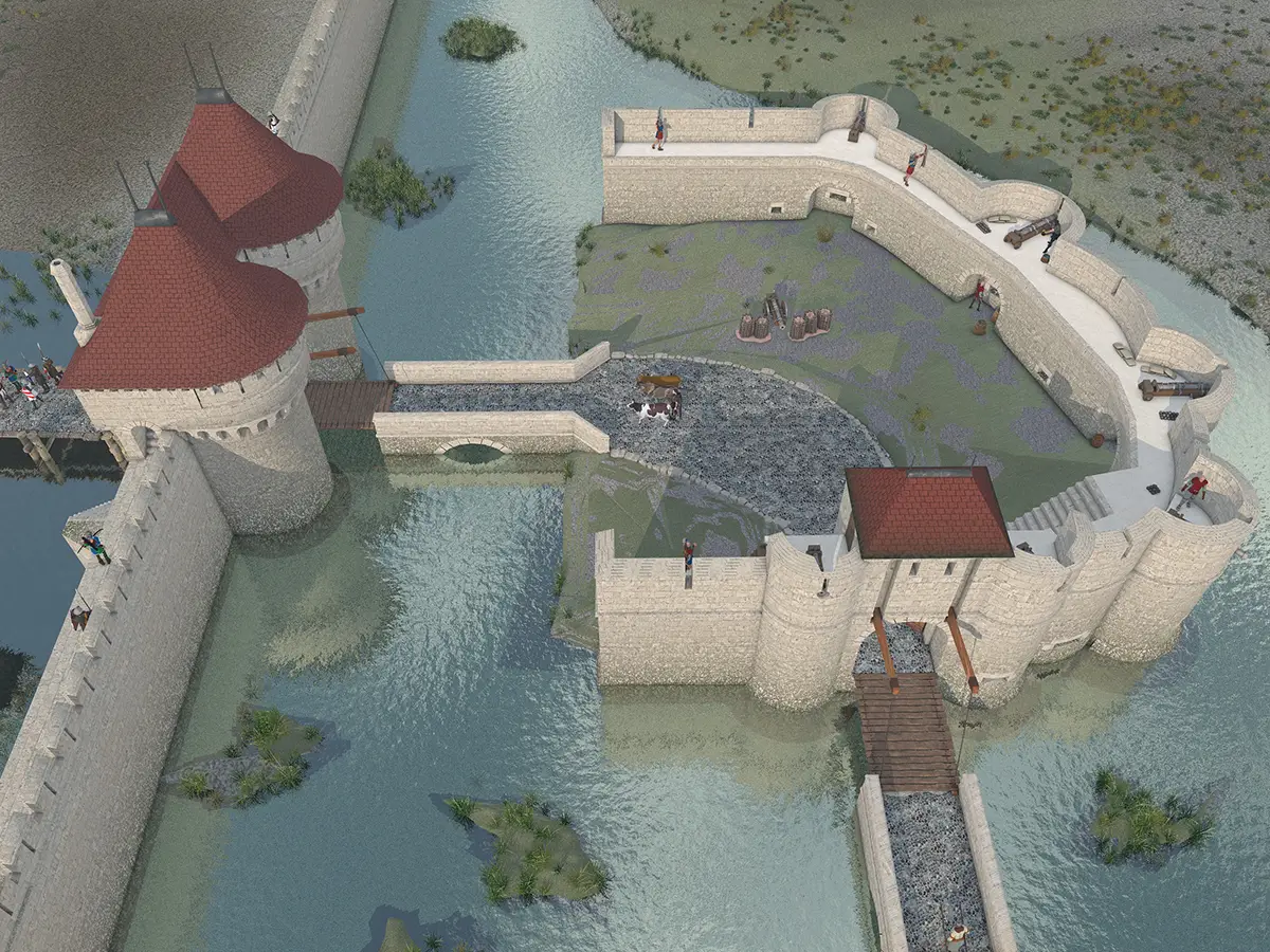 Pour entrer dans le Clos aux Galées, il fallait tout d’abord emprunter un pont dormant, ensuite accéder par un pont-levis au boulevard que l’on traversait par une chassée pavée de silex, poursuivre sur un second pont dormant et enfin passer une porte protégée par ses deux tours. (Proposition de restitution 3 D © Érik Follain)