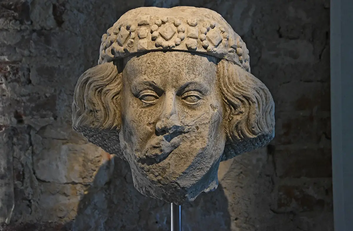 Tête dite de Guillaume le Conquérant (XIVe siècle) de l’église abbatiale Notre-Dame de Jumièges. (Collection lapidaire de l’abbaye de Jumièges – Photo Rodolphe Corbin © Patrimoine Normand)
