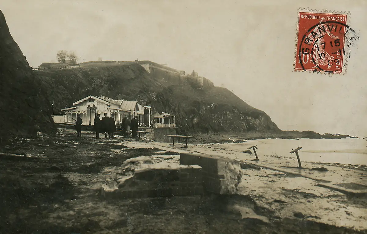 Le site primitif du « casino » quand il était encore une simple extension de bois après la période des cabanes. Ici, l’on voit les dégâts causés par une tempête. Vue vers 1909. (© Coll. Patrimoine Normand)