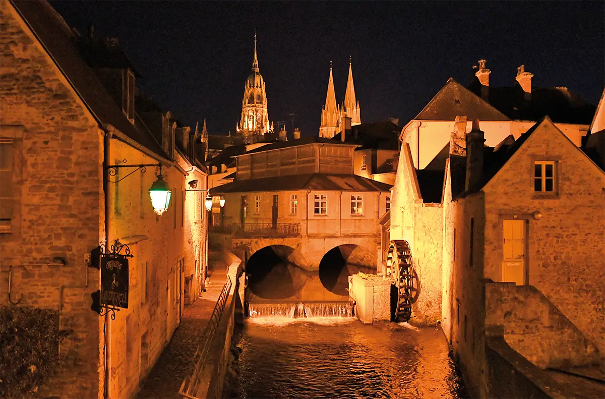 Bayeux. Promenade nocturne sur les bords de l’Aure. En arrière plan la cathédrale Notre-Dame de Bayeux, mélange de styles roman et gothique. (Photo Rodolphe Corbin © Patrimoine Normand)