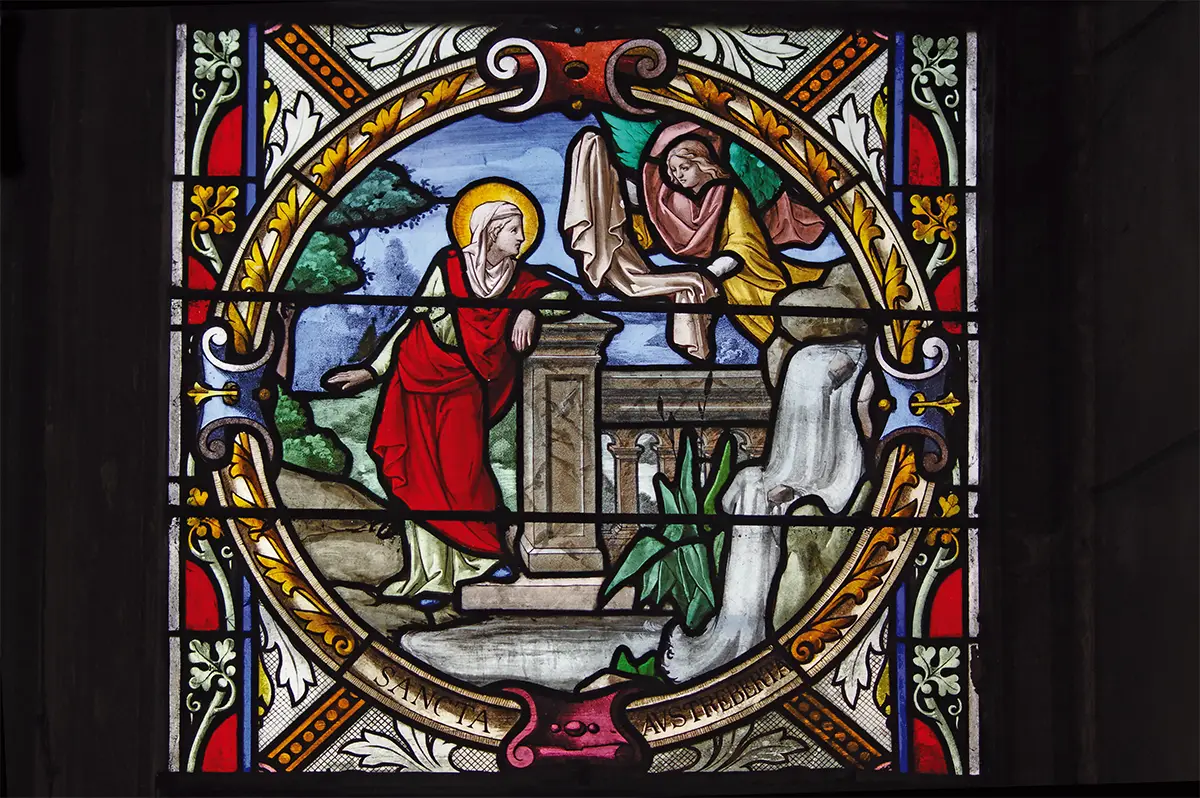 Un ange amène à Austreberthe un voile, symbole de son futur engagement religieux. Vitrail de l’église de Pavilly. (© Stéphane William Gondoin)