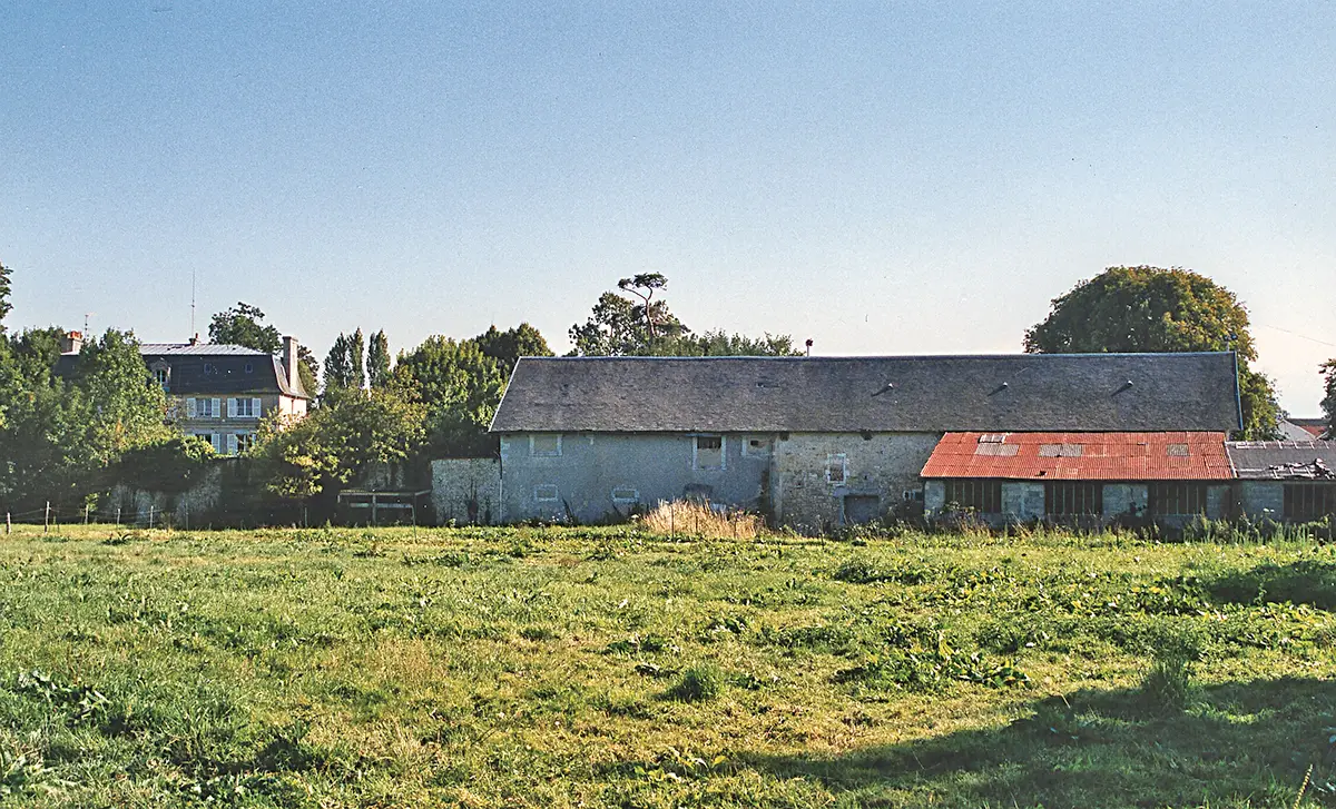 Vue générale du front nord du château de Damigny. Il est précédé d’un fossé sec. Le logis du XIIIe siècle se trouve sur la droite en partie caché par un hangar parasite qui sera détruit. On aperçoit la fenêtre du XIIIe siècle qui était alors encore bouchée, la seconde se trouve cachée par le hangar. La partie couverte d’un enduit gris (à gauche) existe au moins depuis le XVIIe siècle mais, très modifiée au XIXe siècle), elle ne peut être actuellement datée. La partie du château XIXe qu’on aperçoit à gauche en arrière est à l’emplacement du donjon médiéval. (Photo Georges Bernage © Patrimoine Normand)