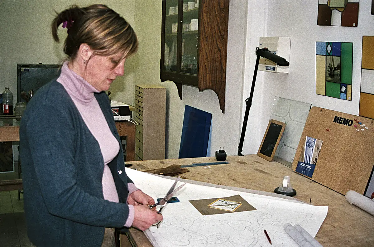 Cette artiste a toujours été fascinée par la couleur ; elle recherchait un métier en rapport avec la couleur, le graphisme et l’art mural. Originaire du Nord de la France, elle s’est inscrite à l’Ecole des Arts Appliqués, à Paris, pour suivre sa vocation. Elle se rattache alors à un atelier spécialisé dans le vitrail. Elle apprend l’art de la peinture sur verre et la technique de la grisaille. Elle passe plusieurs années dans un atelier à Paris avant de s’installer à son compte, à Langrune, en Normandie, à cent mètres du bord de mer, en 1990.