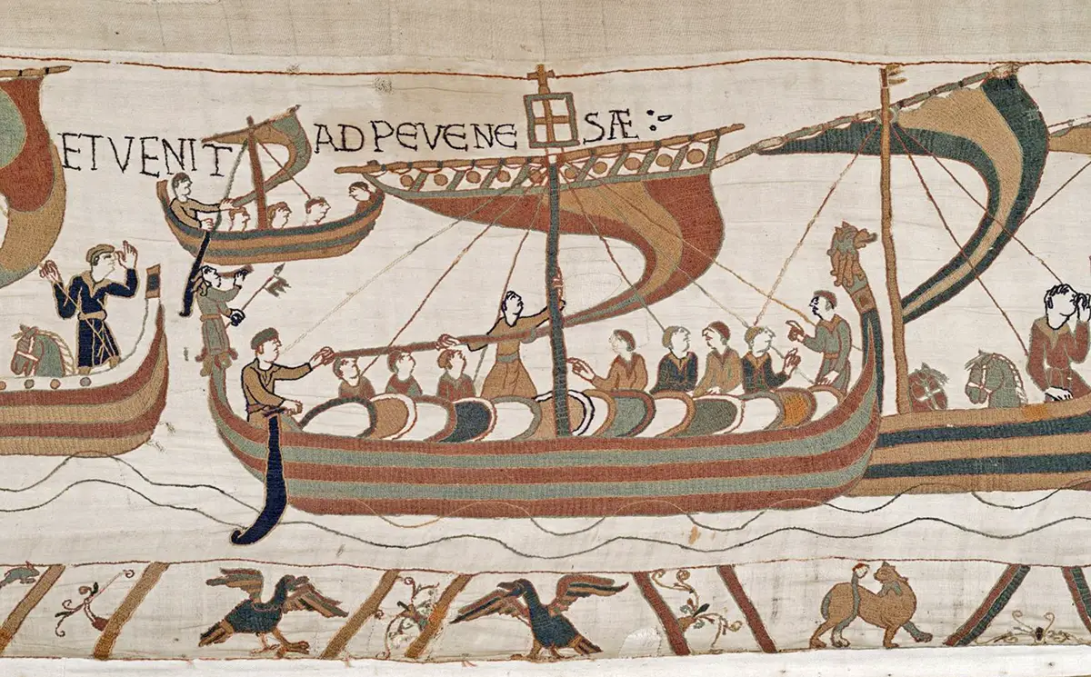 Le 12 septembre, la flotte appareille peu avant l’aube et cingle vers Saint-Valery-sur-Somme, en Vimeu, un fief vassal du duché de Normandie. Il s’ensuit une longue attente, celle de vents meilleurs, et celle du souffle de l’Histoire. Celui-ci se manifeste enfin le 28 septembre, quand le service de renseignements de Guillaume lui apprend le débarquement en Yorkshire d’une armée d’invasion norvégienne menée par son roi Harald Hardrada. Un premier front est ouvert, dont Guillaume va profiter. Il prend la mer en fin d’après-midi, porté par le courant du jusant. Direction : la baie de Pevensey, dans le Sussex, proche d’abbayes amies de la Normandie, ainsi que de la ville et du port de Hastings.