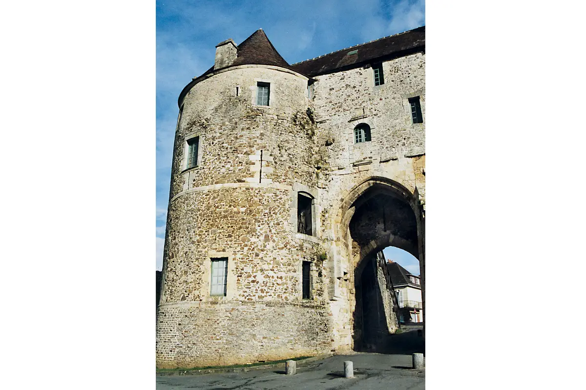 L’imposante Porte des Cordeliers, construite par Pierre du Pont d’Ouilly au XIIIe siècle, domine le Val d’Ante ; c’est la seule des six portes de la ville à conserver son caractère défensif originel. Seule, une de ses deux tours flanquantes a disparu. (Photo Georges Bernage © Patrimoine Normand)