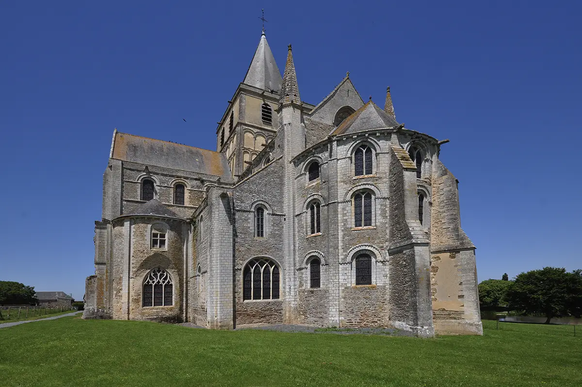 Abbaye de Cerisy-la-Forêt. En tournant le dos à la forêt, c’est là le plus beau point de vue sur l’église abbatiale : l’abside et le transept. L’abside romane comporte trois étages de fenêtres, disposition unique en Normandie. Elle est due principalement à un chœur sans déambulatoire. Cette abside a été renforcée au XIVe siècle, la voûte romane, effondrée, commençait à amener des désordres dans cette construction alors contre-butée par ces puissants contreforts. Quelques fenêtres hautes ont été modifiées en style gothique. Cette abside s’appuie sur le massif rectangulaire du chœur dominé par un pignon et deux clochetons refaits au XIVe siècle. Ce chœur rectangulaire est flanqué, comme à Saint-Nicolas de Caen et à Saint-Gabriel, de deux collatéraux voûtés d’arêtes et longs de deux travées. Celui que nous voyons ici a été repercé au XIVe siècle d’une grande verrière gothique au rez-de-chaussée. La fenêtre d’origine devait être identique à celle de l’étage et celle du côté. (Photo Rodolphe Corbin © Patrimoine Normand)