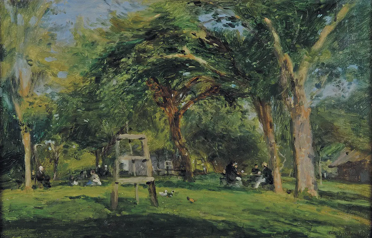Une scène de la vie quotidienne pour les peintres installés à la ferme Saint-Siméon, vue par Adolphe-Félix Cals (Paris 1810-Honfleur 1880). « Dans ce paysage naturaliste qui fut un creuset pour le versant physique de l’im­pressionnisme, la représentation des éléments, l’esprit de la ferme Saint-Siméon joua un rôle capital puisqu’il favorisa le mélange d’une nature sublime mais bien souvent rude, triste, violente, avec ses habitants permanents ou provisoires, saisis dans la cruelle vérité de leur labeur ou de leur oisiveté. ». (Alain Tapié, De Corot à Vuillard, Peindre en Normandie, CID, 2005)