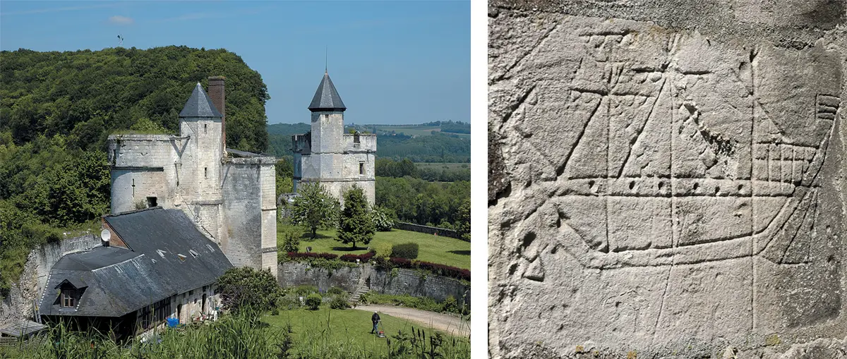 Château de Tancarville (76). Un navire a été gravé sur la face interne du parapet de la terrasse de l’une des tours du châtelet d’entrée (au premier plan, sur la photo). (Photos © Érik Follain)