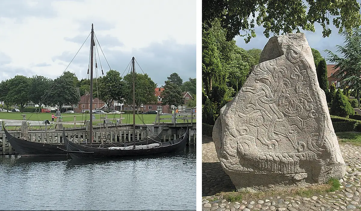 Le port de Roskilde. (© Yoan Simon) ; La pierre de Jelling érigée par Harald à la dent bleue. (© Yoan Simon)