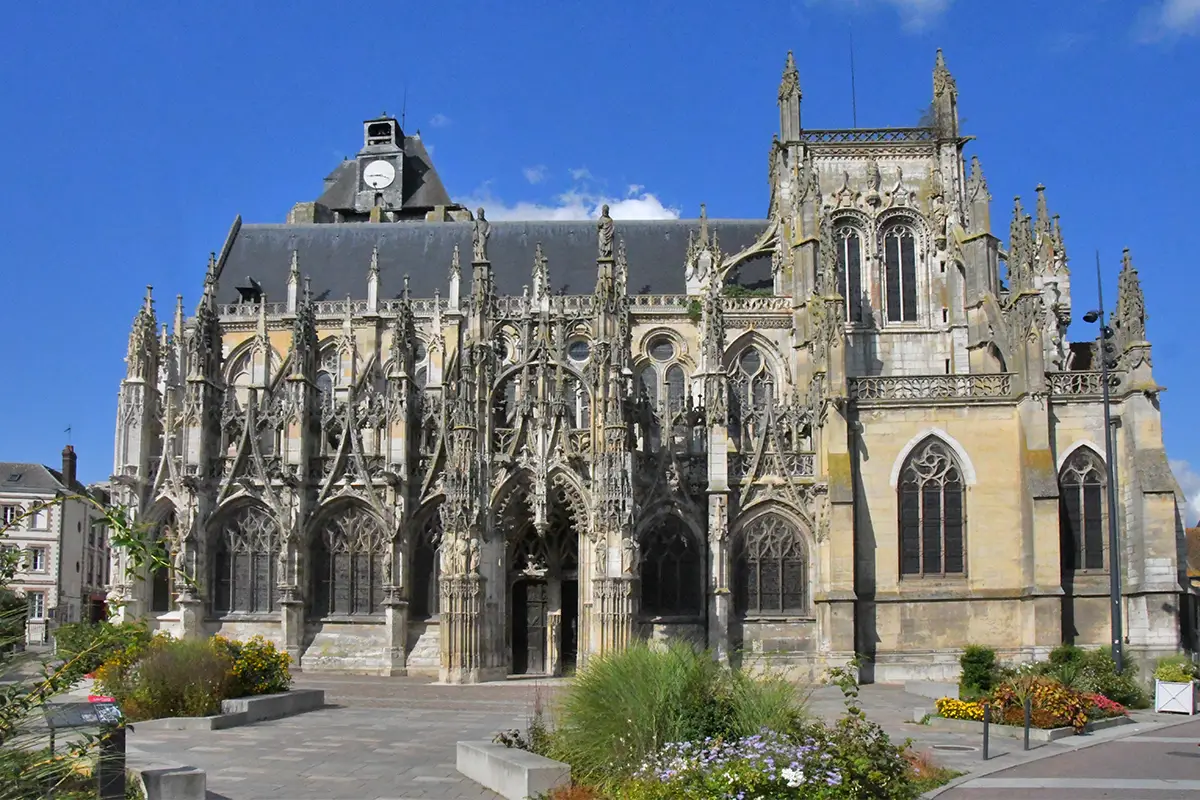 L’église Notre-Dame de Louviers est le monument le plus impressionnant de Louviers. Elle dispose d’une façade de style gothique flamboyant qui contraste avec la rudesse de sa tour-beffroi, très austère. (Photo Rodolphe Corbin © Patrimoine Normand)
