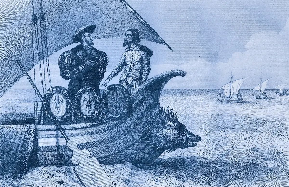 François Ier reçu à Dieppe par Jehan Ango. L’armateur organisa une sortie en mer pour le souverain et sa cour. Gravure romantique du XIXe siècle. (© Collection Stéphane William Gondoin)