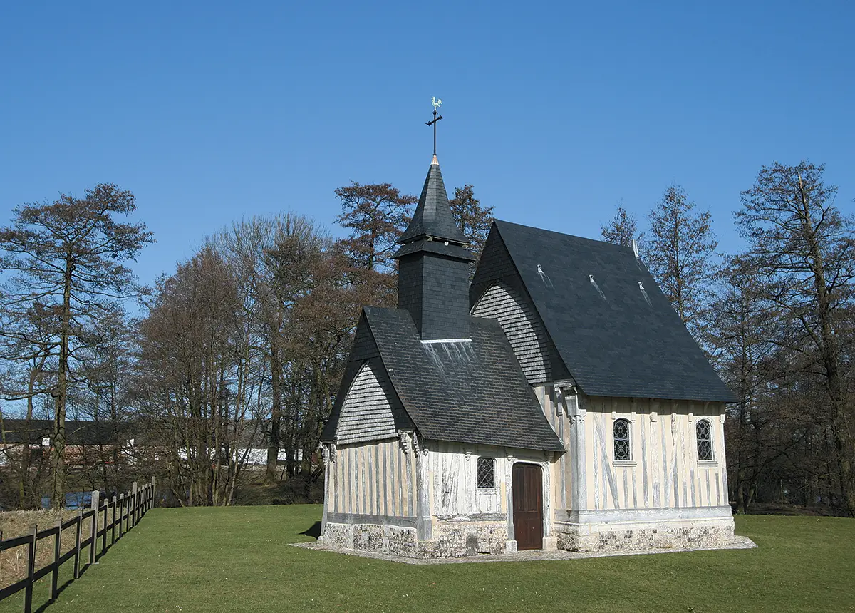 Chapelle des Blanques, à Alvimare. Joyau méconnu du patrimoine cauchois, cette chapelle du XVIe siècle est la seule entièrement à pans de bois en Seine-Maritime.